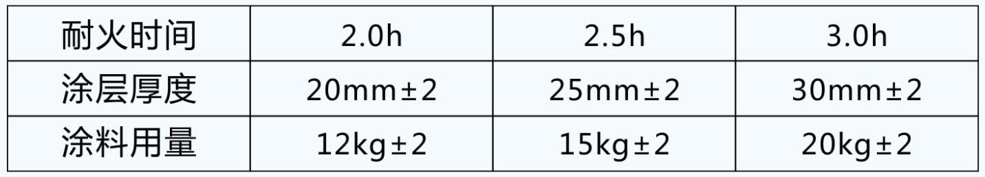 五、耐火時間和涂層厚度及涂料用量參考下表∶耐火時間3.0h,涂層厚度:7.0mm±0.2,涂料用量:7kg±0.2